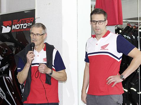 Leon Scheidegger, Auszubildender im dritten Jahr, Marcel Schürch, neu im Team, mit Abschluss als Kleinmotorradmechaniker und nun in der Ausbildung für die grossen Fahrzeuge, Sandra Blatter, Administration, und Angela Schönsee, ab Sommer ihre Nachfolgerin, sowie Vater Rolf zählen zu Marco Blatters Team, das er in seiner offiziellen Ansprache kurz vorstellte. Vom Polymechaniker zum Töffmechaniker ist der 35-jährige Marco am 1. April 2017 offiziell zum neuen Geschäftsführer nicht vom bisherigen Blatter 2-Rad-Sport, sondern von Blatter Moto geworden. Am Standort an der Oberburgstrasse 11A in Burgdorf wurde am 1. und 2. April 2017 nebst der Geschäftsübergabe auch die Frühlingsausstellung mit den neusten Honda-Modellen, mit Motorradbekleidung und Zubehör genossen.