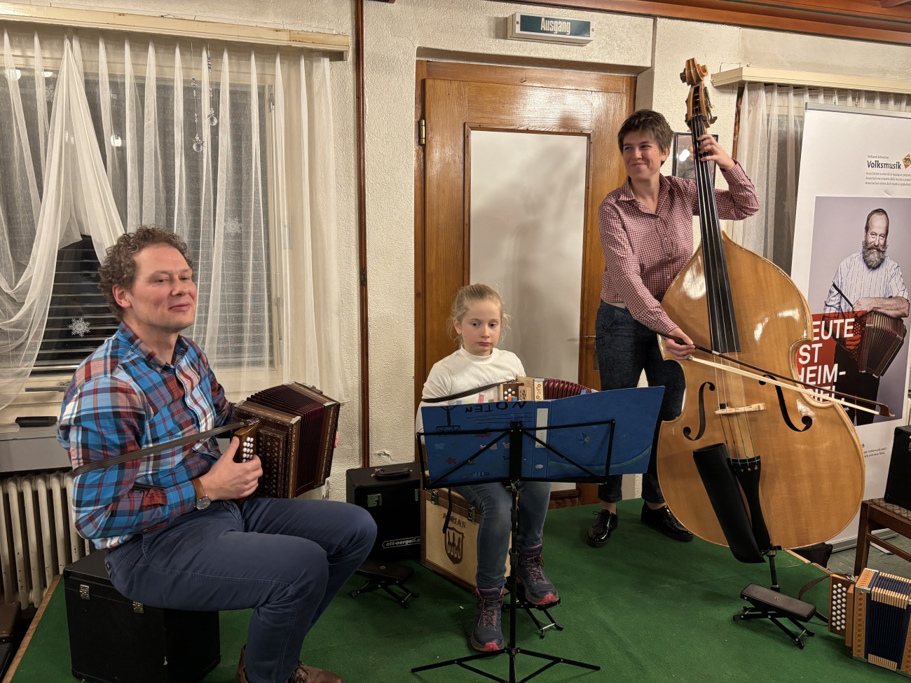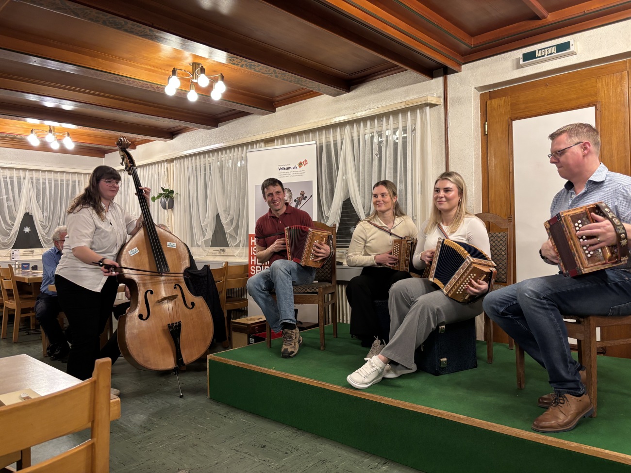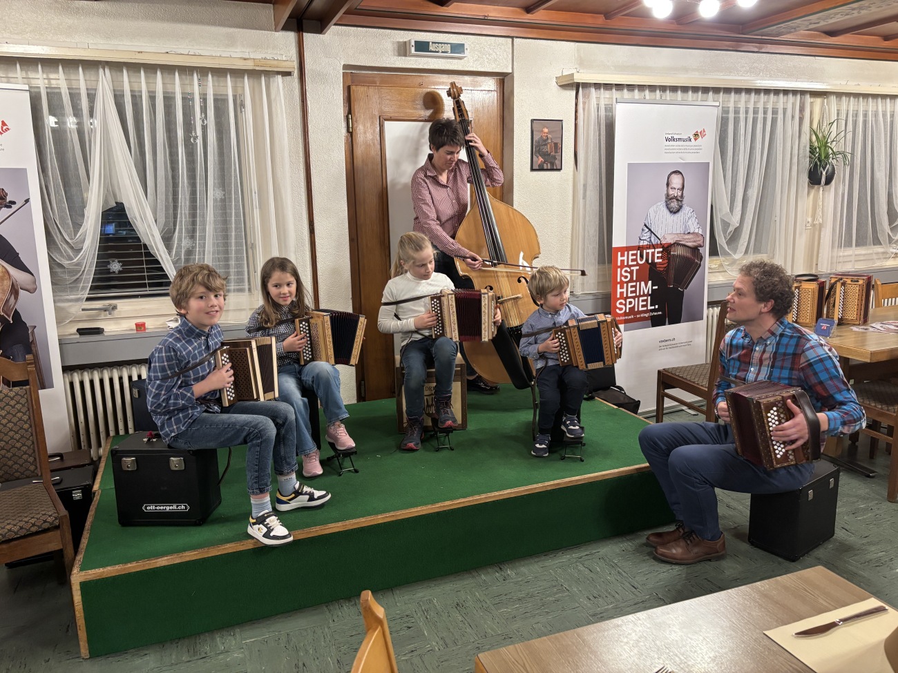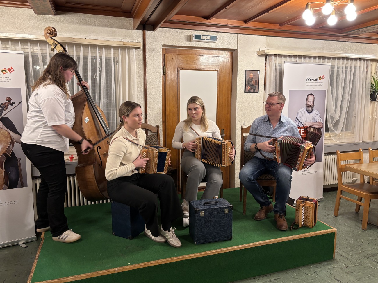 Ein besonderer Höhepunkt des Abends war der Auftritt des Gastmusikanten Marcel Zumbrunn. Seit vielen Jahren ist Marcel Zumbrunn eine feste Grösse in der Schweizer Volksmusikszene. Bereits im Jahr 1989 entdeckte er seine Leidenschaft für das Schwyzerörgeli und blickt seither auf eine äusserst erfolgreiche musikalische Laufbahn zurück. Ein weiterer Meilenstein folgte im Jahr 2008 mit der Gründung seiner eigenen Schwyzerörgelischule, in der er sein Wissen und seine Begeisterung an kommende Generationen weitergibt. Gemeinsam mit den Nachwuchstalenten stand er auf der Bühne und sorgte für eindrückliche musikalische Momente. In Solo-Darbietungen wie auch im gemeinsamen Musizieren wurde deutlich, mit wie viel Freude, Engagement und Herzblut die jungen Musikerinnen und Musiker bei der Sache sind. Die spürbare Begeisterung für die Volksmusik übertrug sich rasch auf das Publikum und machte den Abend zu einem gelungenen Erlebnis.