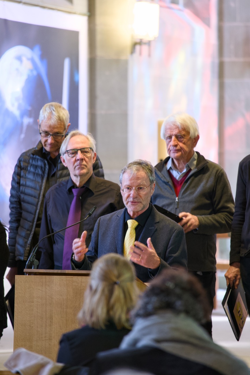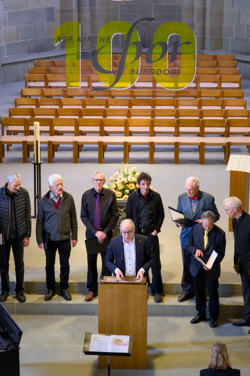 Nach dem gemeinsam gesungenen Psalm «Herz und Herz zusammen» – der Chor hatte diesen auch bei seinem ersten Auftritt vor 100 Jahren gesungen – zeichnete Markus Gerber, Präsident des Kirchenchors, in seinem historischen Rückblick die Gründung des Chors und dessen Vorgeschichte nach und spannte den Bogen bis in die Gegenwart. In all den Jahrzehnten habe der Chor sich gewandelt; seine Botschaft jedoch sei unverändert. Ein Aufsatz zu Markus Gerbers Referat erscheint im Burgdorfer Jahrbuch 2027.