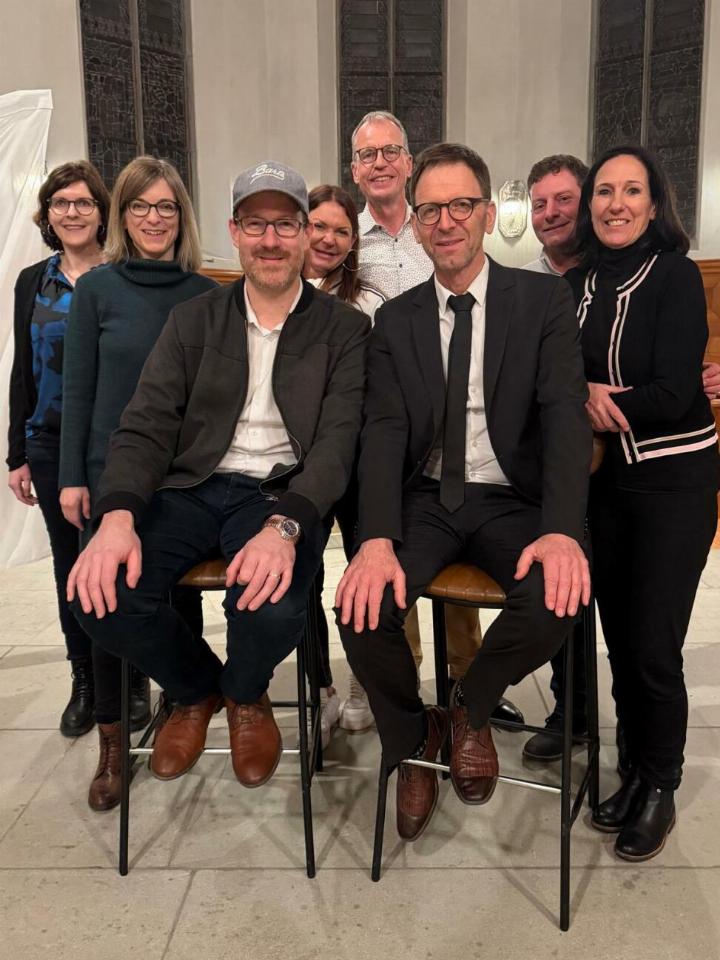 Ganz dem Genre entsprechend erzählten die Chansons hintergründige Geschichten mit feinen Pointen aus dem täglichen Leben – mit all ihren Höhen und Tiefen. Die Lieder waren nicht nur inhaltlich amüsant und unterhaltsam, sondern überzeugten auch musikalisch: Mit zwei ausdrucksstarken Stimmen und gekonntem Gitarrenspiel begeisterten Ädu Baumgartner und Rolf Marti das Publikum. Immer wieder ver standen sie es, die Zuhörerinnen und Zuhörer aktiv einzubeziehen – sei es beim Mitsingen eines Refrains oder beim humorvollen Ergänzen einzelner Textstellen. Ein besonders gelungenes Beispiel: Zur Melodie des Evergreens von Joe Dassin «Les Champs-Élysées» schufen sie ein eigenes Lied mit dem Refrain „oh Marktgass vo Bärn». Dieser hallte kräftig aus vielen Kehlen durch die Kirche und verlieh dem Abend für einen Moment gar einen Hauch von Weltstadtflair. Gegen zehn Uhr abends endete die letzte Zugabe und das Publikum verabschiedete die beiden Künstler mit grossem Applaus. Doch der Abend war damit noch nicht vorbei. Beim anschliessenden Apéro liessen die Anwesenden die gelungene Veranstaltung gemütlich ausklingen.