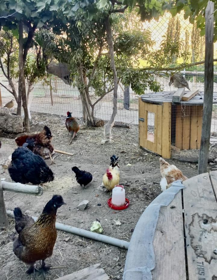 Mein Blick schweift über die kahlen Berge auf der gegenüberliegenden Talseite und bleibt schliesslich am Gehege vor der Terrasse hängen. Ein kleines Reich für Hühner und anderes Geflügel, eine gemischtrassige – dieser Begriff ist für Tiere durchaus noch zulässig – Gesellschaft, die hier ihren Alltag gemeinsam meistert. Weisse und schwarze Hühner fallen nicht weiter auf, doch dazwischen stolzieren drei Fasane, eine Truthahnfamilie und diverse Hühner mit Federbüscheln an den Füssen und auf dem Kopf. Auch die Hähne, kleine und grosse, bringen Farbe in die Gemeinschaft und lassen die dezenten Fasanenweibchen noch unscheinbarer wirken. Die kleinsten Bewohner, Wachtelküken, stecken zurzeit noch unter der Wärmelampe, während die Perlhühner ständig einen Anlass finden, sich lautstark in Szene zu setzen. Wenn dieser Hühnerhof ein Staat wäre, übernähmen die Hühner wohl die Rolle der Politiker/innen. Beim genauen Hinschauen lässt sich zwischen all den Vögeln sogar noch ein Zwerghase entdecken, der wohl gar nicht mehr weiss, dass er einer ist. Der einzige Vierbeiner in diesem kleinen Universum ist von seinen Mittieren voll akzeptiert und längst integriert. Früher leistete ihm eine Zibbe Gesellschaft, die regelmässig Junge zur Welt brachte. Die Jungtiere gelangten dann via Tierarzt für ein kleines Entgelt zu neuen Besitzenden. Leider ist das Muttertier kürzlich altershalber gestorben.