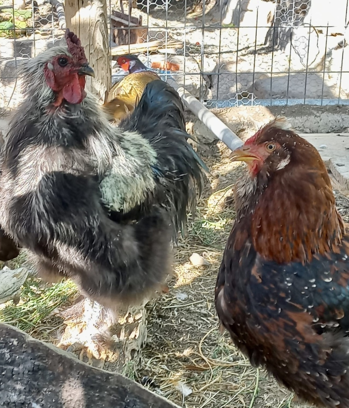 Es ist gut, dass in diesem Gehege nur Federvieh und ein Transrassist heimisch sind und keine Vertreter der Gattung Homo sapiens. Müssten da Menschen und nicht unbedarfte Tiere zusammenleben, könnten sich diverse Probleme ergeben. So aber reichen die Ressourcen für alle, nicht einmal das dümmste Vieh käme auf die Idee, Futter zu horten und seine Mitbewohner darben zu lassen. Auch die Vielfalt stört hier niemanden, es ist sogar schon vorgekommen, dass sich Hennen um kleine Fasänchen kümmerten, deren Mutter gestorben war. Die Tiere sehen auch kein Problem im Umstand, dass demnächst noch Pfaue einziehen werden und der Platz entsprechend geteilt werden muss. Diese Harmonie ist vielleicht auch dem Umstand geschuldet, dass allzu egoistische Gockel aussortiert werden und die Gemeinschaft verlassen müssen, e Guete. – Schade, dass schon bald die Rückkehr in die Schweiz ansteht!»