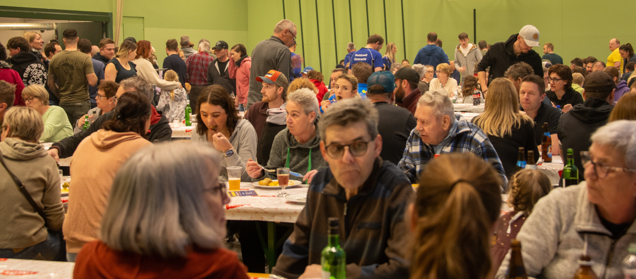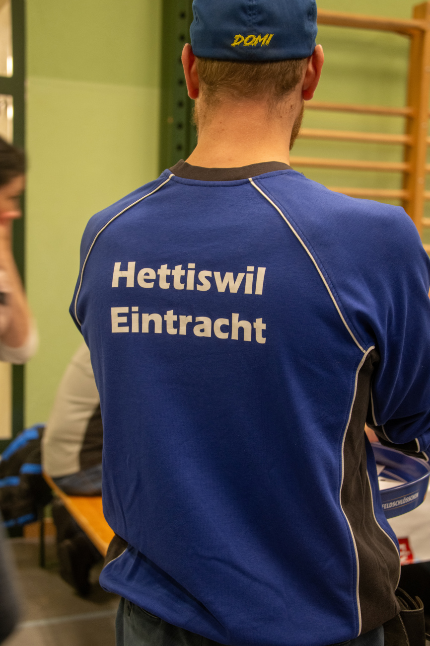 lette-Abend der Hornussergesellschaft Hettiswil-Eintracht. Seit seiner Premiere im Jahr 1996 hat sich der Raclette-Abend zu einem Fixpunkt im Hettiswiler Veranstaltungskalender entwickelt. Bereits kurz nach der Türöffnung strömten zahlreiche Gäste in die Turnhalle, sodass die Warteschlange vor den Raclette-Öfen stetig länger wurde. Beim Anstehen ergaben sich schnell Gespräche. Die Besucher/innen kennen sich aus dem Dorf, einem Verein oder von gemeinsamen Hundespaziergängen, sodass die Wartezeit mit Plaudern angenehm überbrückt werden konnte.