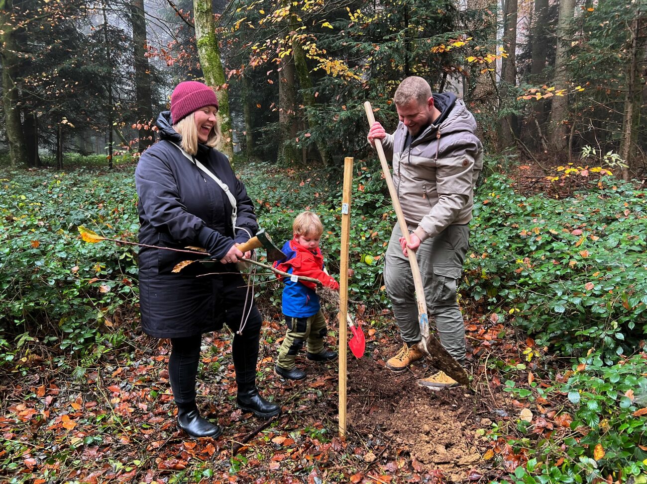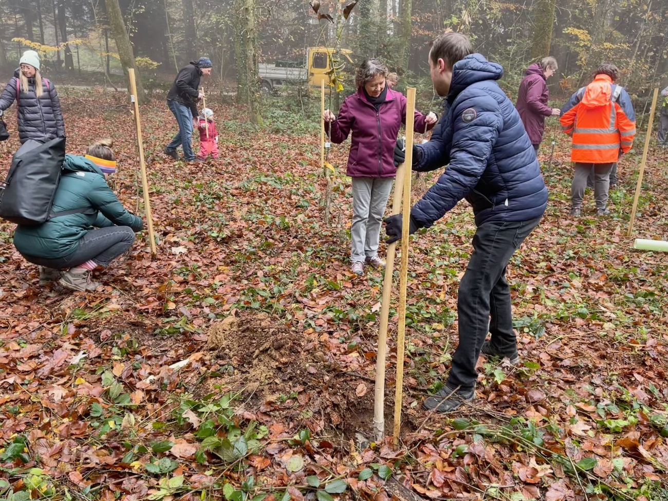 12.11.2025 Koppigen, Koppigen, Gesellschaft, NaturAm vergangenen Samstag fand der Herbst-Pflanztermin der Burgergemeinde im Geerenwald in Koppigen statt. 16 junge Bäume, darunter Eichen, Edelkastanien, Nussbäume und Douglasien, wurden von begeisterten Baumgotten und Baumgöttis zusammen mit ihren Familien in den Boden gebracht. Dank zur Verfügung gestellter Kinderschaufeln war niemand zu klein, um mitzuhelfen.