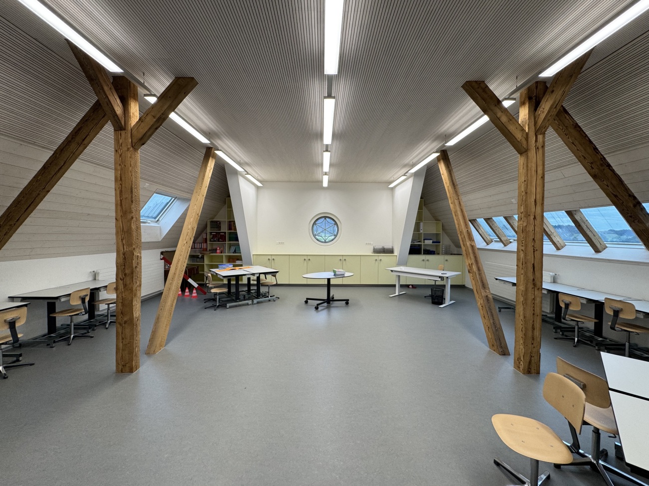 Grund zur Freude gab es über die beiden neuen Schulzimmer, die im Dachstock des historischen Gebäudes entstanden sind. Dank dem grossen Einsatz von Simon Röthlisberger, Gemeinderat Ressort Hochbau, und dem Ja der Stimmbürgerinnen und Stimmbürger konnte dieser Umbau realisiert werden.
