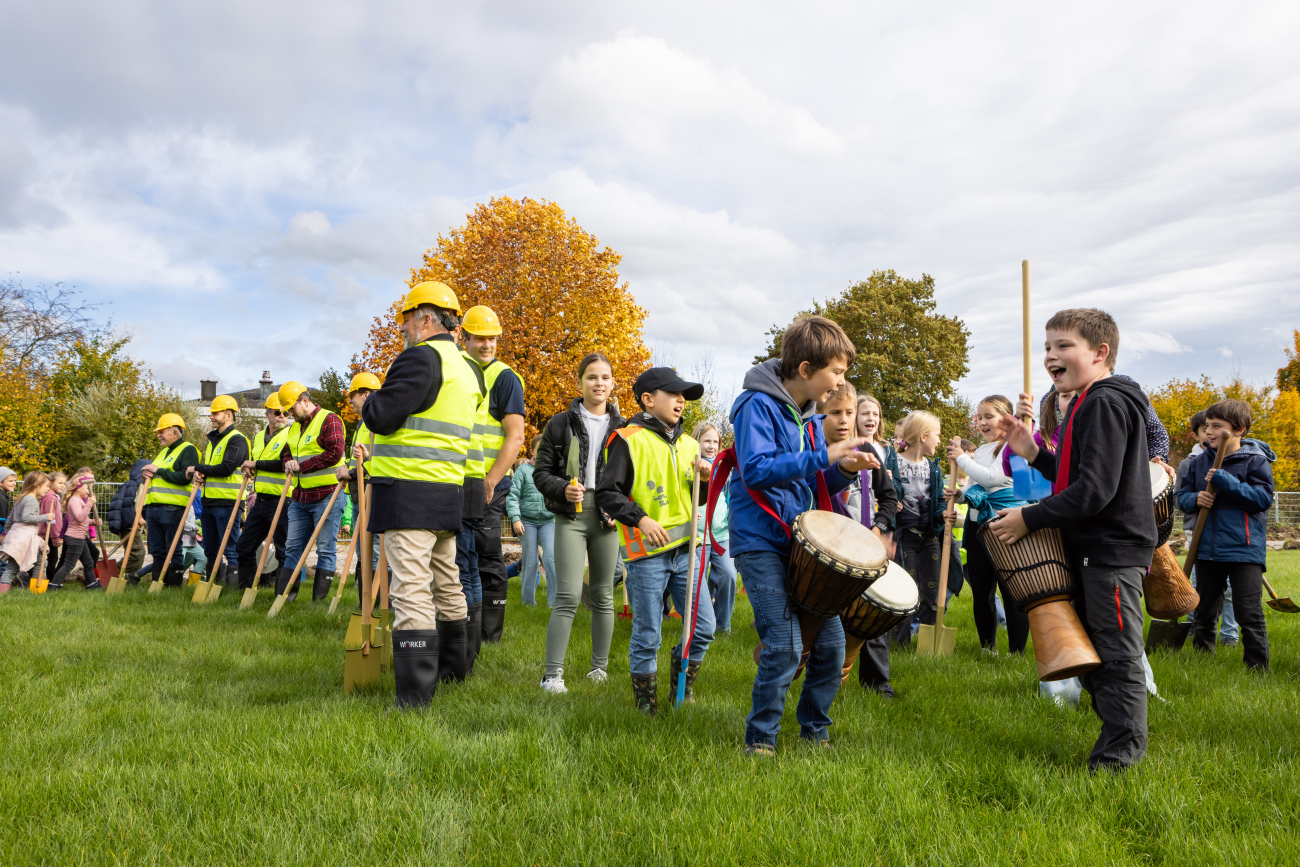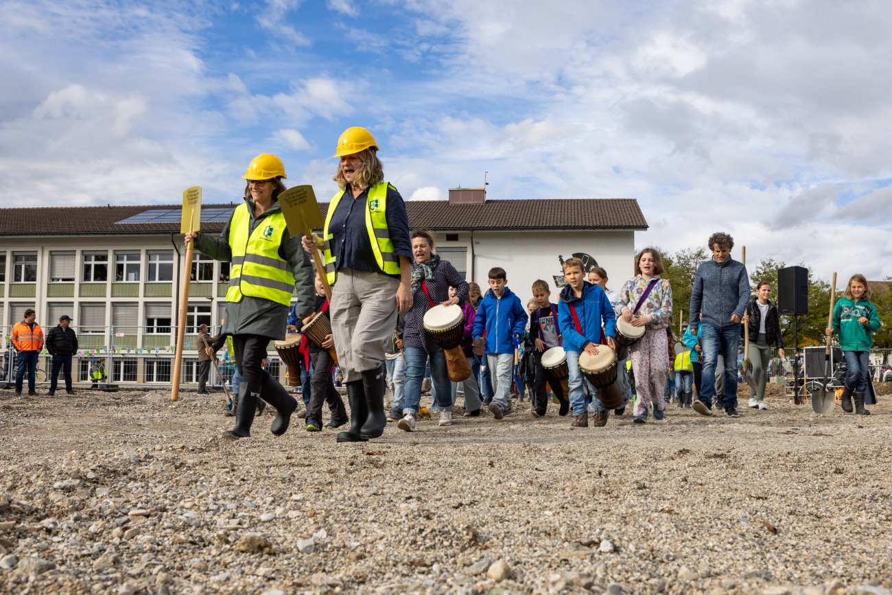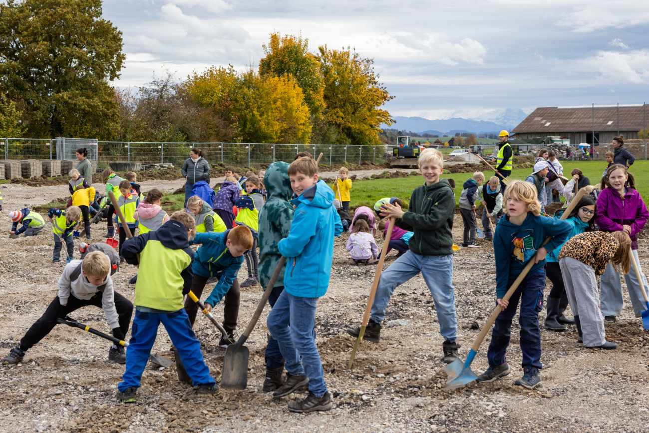 Anwesend waren der gesamte Gemeinderat, ehemalige und aktuelle Mitglieder der Projektgruppe «Schulraum31», Schulleitungen, Lehrpersonen, Mitglieder des Schulverbandsrats, das Schulhauswartungsteam, Vertreterinnen und Vertreter der Parteien, Kommissionsmitglieder verschiedener Ressorts, Planerinnen und Planer, Landwirte, die während der Bauzeit Flächen zur Verfügung stellen, sowie Anwohnerinnen und Anwohner. Einen besonders schwungvollen Auftritt hatten die rund 130 Schulkinder, die mit einem selbst gedichteten «Spatenstichlied» zum Festplatz zogen und die Feier musikalisch und schaufelnd mitgestalteten.