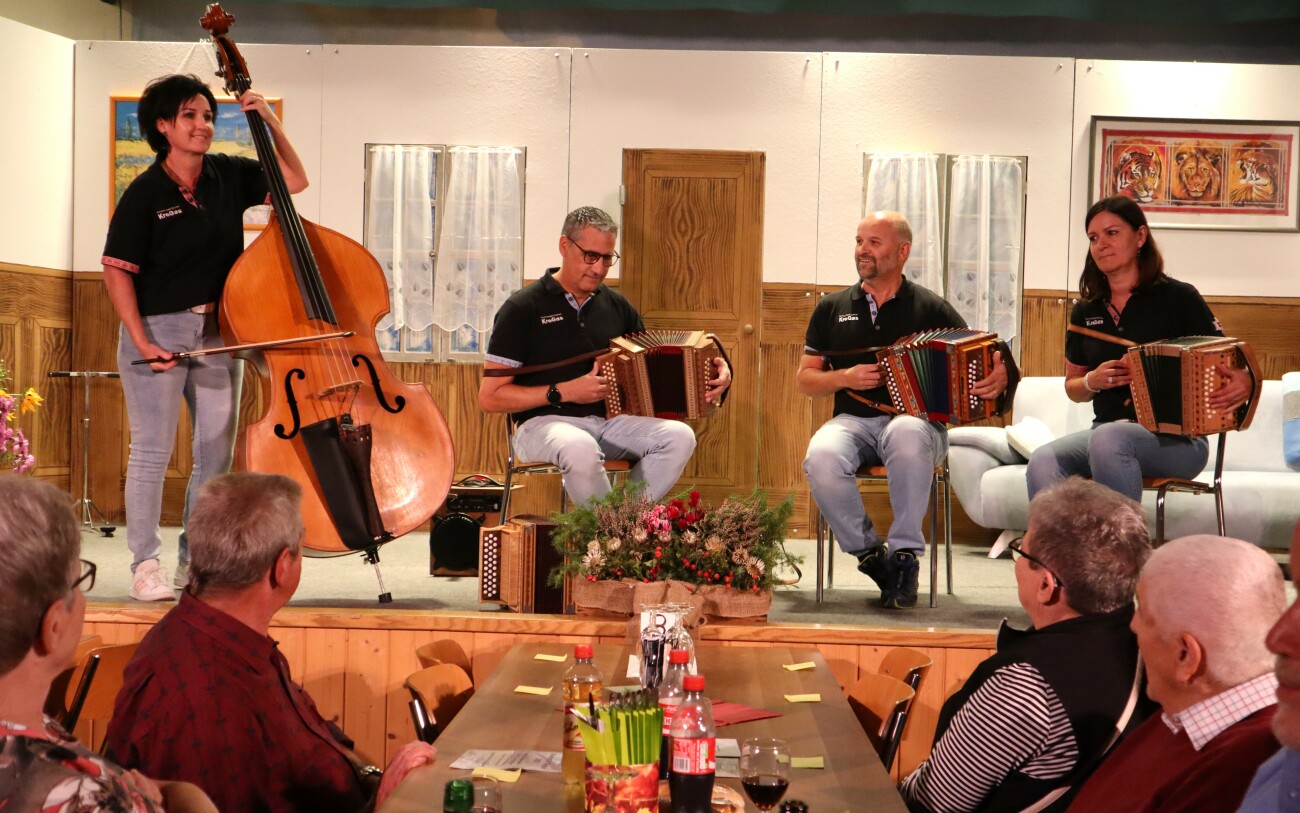 Immer wieder ist es ein schönes Bild, Sängerinnen und Sänger in festlicher Kleidung auf der Bühne zu sehen. Unter der Leitung seiner Dirigentin Rita Lusti eröffnete das Chörli mit den stimmigen Liedern «Aabestärn» von André von Moos und der Jahreszeit entsprechend mit der «Herbstmelodie» von Miriam Schafroth das Jahreskonzert 2025. Lieder von Ueli Moor, Fredy Wallimann, R. Fellmann und Adolf Stähli sind ebenfalls immer wieder gern gehörte Kompositionen. Den grossen Applaus verdankten die Sängerinnen und Sänger sehr gerne mit der Zugabe des humorvollen Jodelliedes «Säg Froueli, gib doch nah» von Ruedi Bieri. Mit rassigen und teilweise selber komponierten Stücken umrahmte das Schwyzerörgeli-Quartett KreGas im Viererteam die Liedervorträge und brachte Stimmung in den Saal. «KreGas» ist ein Wortspiel aus den Nachnamen der beiden Paare Krebs und Gasser aus Burgistein und Ersigen.
