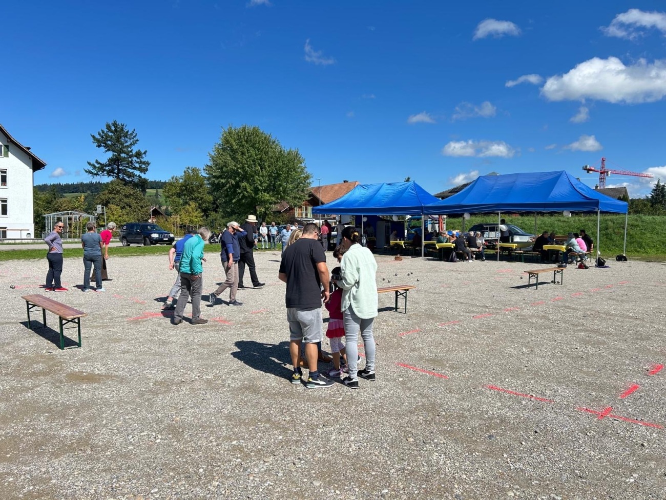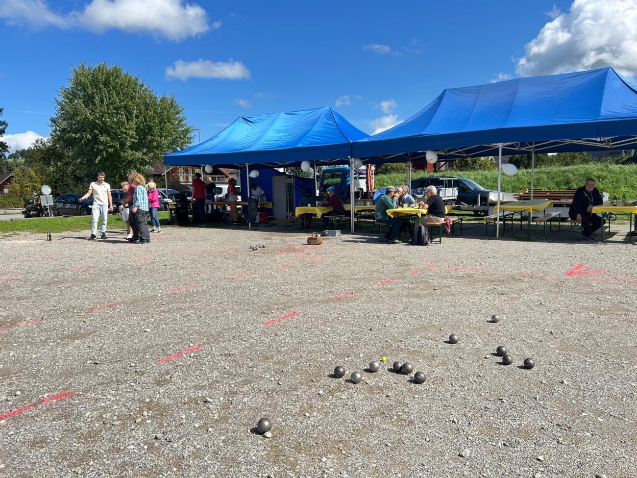 Für Schatten und Abkühlung war ebenfalls gesorgt: Zwei grosszügige Zelte boten Schutz vor der Sonne und luden zum Verweilen ein. Kinder konnten sich auf dem angrenzenden Spielplatz austoben, während die Erwachsenen bei einem kühlen Getränk dem Spielgeschehen folgten oder selbst zur Kugel griffen.
