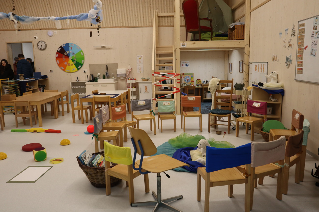 Vor dem Infoanlass bot sich den Anwesenden die Gelegenheit, den fertiggestellten neuen Kindergarten zu besichtigen. Insgesamt sind es momentan drei Kindergartenklassen und im Hinblick auf weiteren Zuwachs wurde eine vierte Klasse eingeplant. Am 5. Januar 2026 waren die neuen Räumlichkeiten bezogen worden.