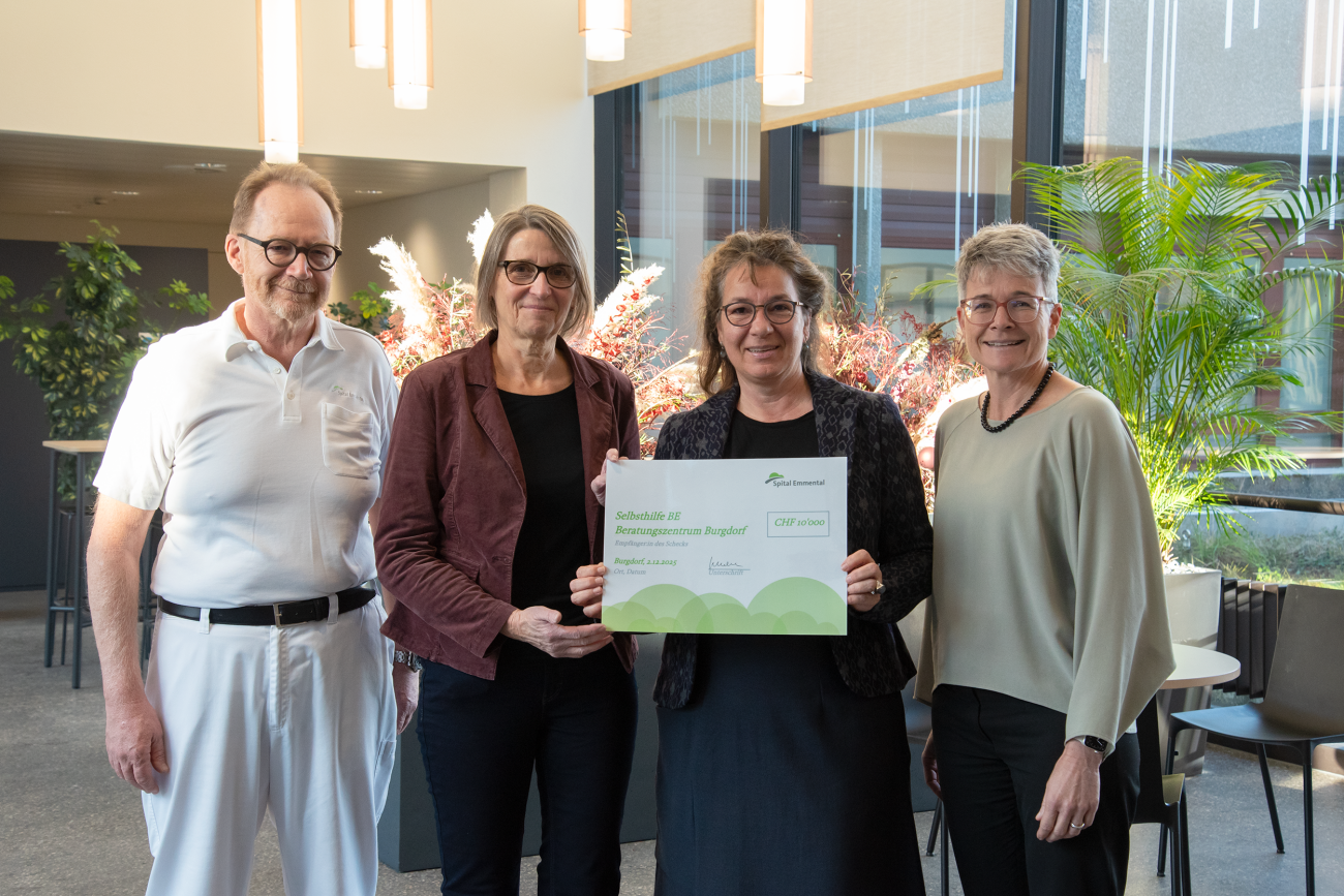 «Wir freuen uns sehr über die Spende des Spitals Emmental», sagt Gabriela Kühni, Beraterin des Beratungszentrums Burgdorf von Selbsthilfe BE. «Gemeinschaftliche Selbsthilfe stärkt Menschen nachhaltig: Der Austausch in einer Gruppe schafft Entlastung, Orientierung und neue Perspektiven. Mit dieser Unterstützung können wir unsere Beratungen sowie den Aufbau und die Begleitung von Selbsthilfegruppen weiter ausbauen – ganz direkt zugunsten der Menschen in der Region.»