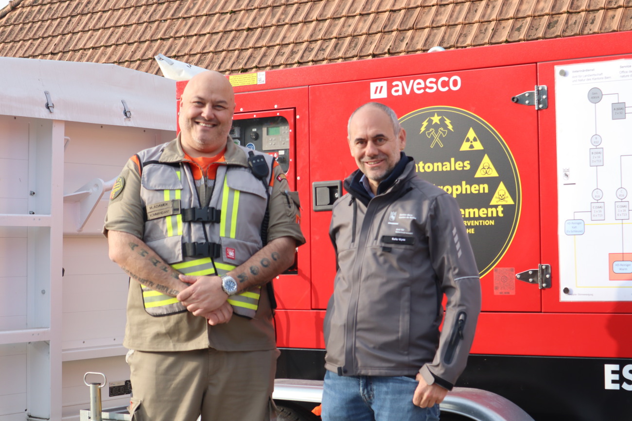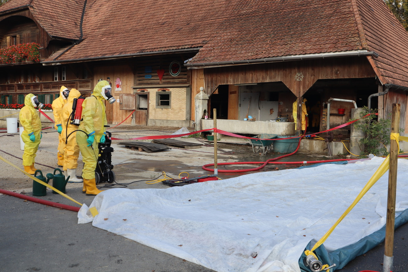 Auf dem Dorfplatz in Mülchi wurden in der vergangenen Woche etliche Medienschaffende von Reto Wyss, dem Kantonstierarzt und Vorsteher des Amts für Veterinärwesen, und Manuel Adamek, dem Kommandanten des Kantonalen Katastrophen Einsatzelements (KKE) Bern, begrüsst und willkommen geheissen. Unter ihrer Leitung wurde ein Ausbruch der ansteckenden MKS auf einem Landwirtschaftsbetrieb simuliert. Reto Wyss erklärte, wie ein realistisches Szenario bei einem Seuchenausbruch aussehen würde. «Es muss unbedingt verhindert werden, dass ein Virus aus einem Tierbestand auf andere Tierbestände übergreifen kann. Deshalb ist der erste Schritt immer die Sperrung des Betriebes. Alle Tiere auf dem betroffenen Betrieb, die empfänglich sind für diese Krankheit, müssen getötet werden. Die toten Tiere kommen in die GZM nach Lyss, werden zu Tiermehl verarbeitet und anschliessend verbrannt. Damit kann das noch vorhandene Virus vernichtet werden.»