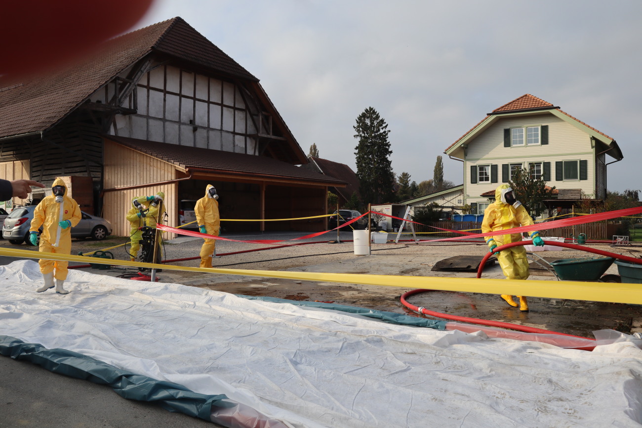 Mit eindrücklichen Informationen führte Manuel Adamek die Anwesenden über das abgesperrte Areal. Er zeigte jegliche Stationen eines Einsatzes und die notwendigen Vorbereitungen und Abläufe auf, damit in einem erneuten Ernstfall eine Ausbreitung verhindert werden kann.