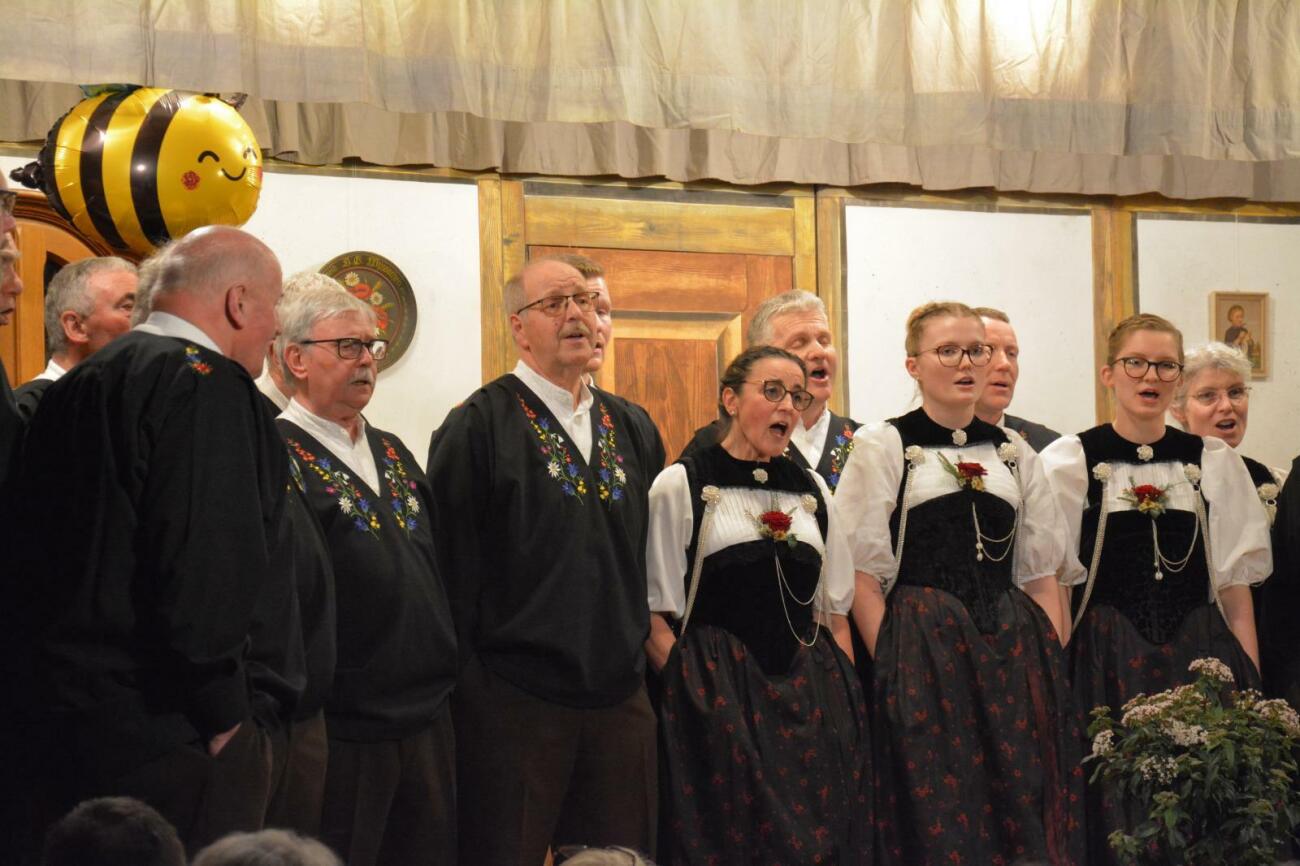 Für die Konzerte hatte der Chor das Motto «vo zersch bis zletscht» ausgesucht. «Früeligschraft» von Peter Schenk beschreibt das Erwachen der Natur. Mit einem Augenzwinkern erschienen passend zum Text zwei Bienen über den Köpfen der Sängerinnen und Sängern. Der Jutz «Läbesgschicht» von Ueli Moor erzählte ohne Worte die Geschichte des Lebens mit charakteristischen Abschnitten.