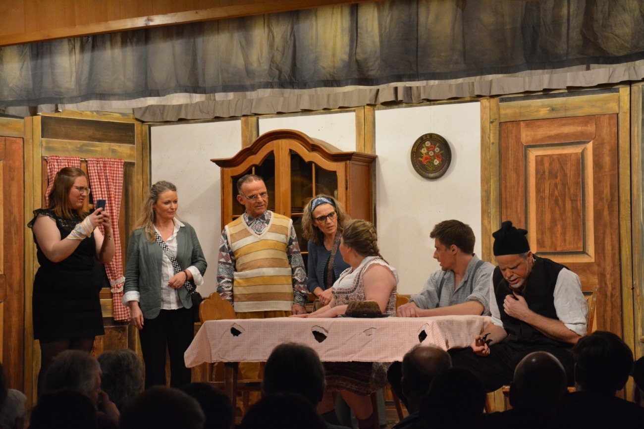 Nach einer kurzen Pause übernahm die Theatergruppe. Mit dem Schwank «E Stall voller Narre» von Silvia Pomej strapazierte sie die Lachmuskeln der Anwesenden gewaltig. Eine von Geldsorgen geplagte Bauernfamilie lädt zahlende Gäste zu sich auf den Hof ein und bietet Ferien und Mitarbeit im Betrieb als Erholung an. Weil sich die Gäste nicht immer wie geplant verhalten, entstehen viel Verwirrung und ein Durcheinander.