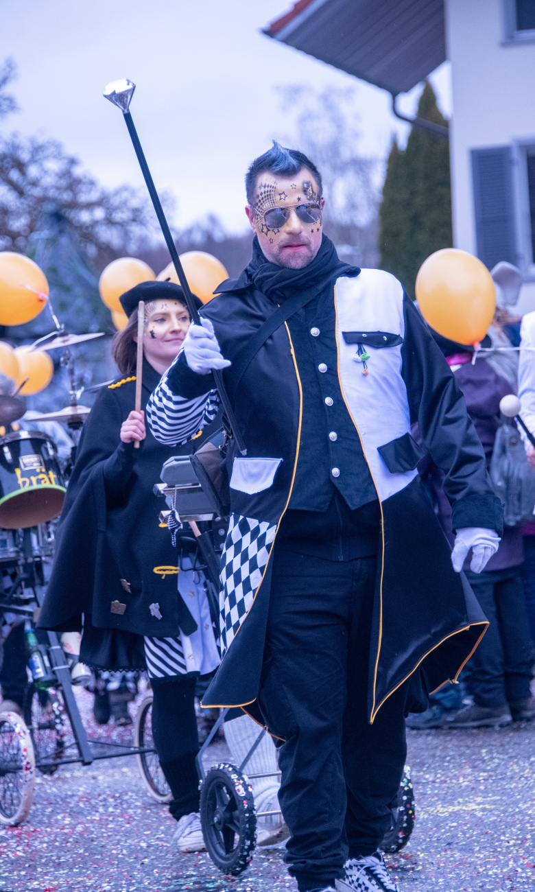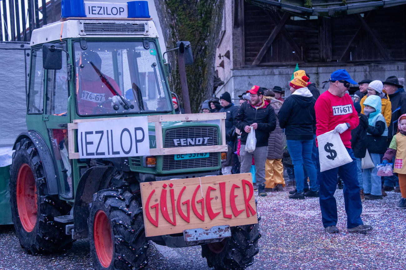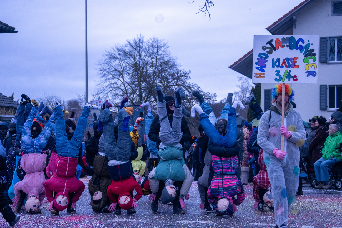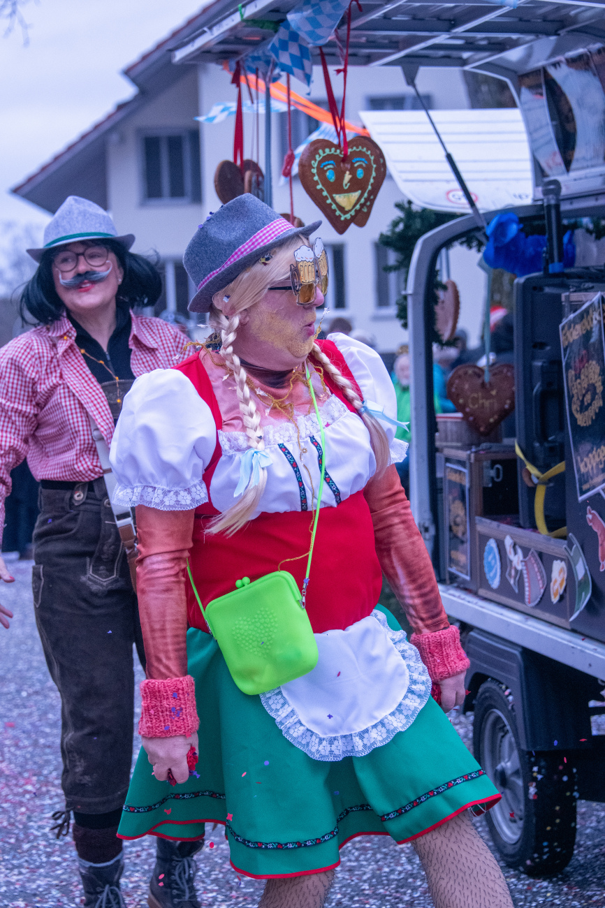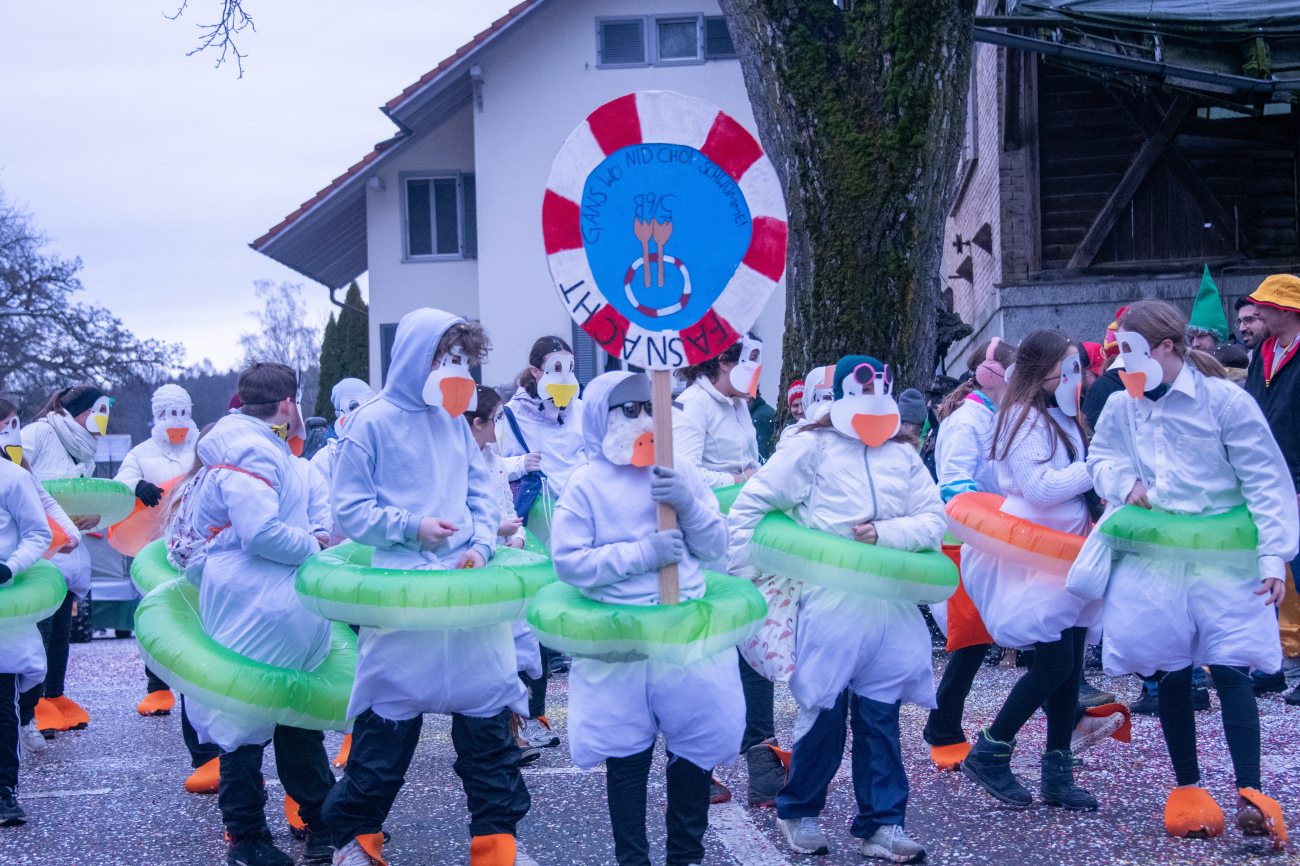 Pünktlich um 14.05 Uhr am Samstag, 21. Februar 2026, ertönte dann der legendäre Knall, der den Fasnachtsumzug in Gang setzte. Genau zum Start des Umzugs hörte der Regen auf, als hätte er dem närrischen Treiben bewusst Platz gemacht. Angeführt von der ortsansässigen Guggenmusik «Fädereböck» zogen kreative Wagen und witzig verkleidete Gestalten durch das Dorf. Einige Gruppen präsentierten ihre Sujets mit originellen Ideen, die für laute Lacher sorgten. Fast die gesamte Dorfbevölkerung säumte die Strassenränder, wetterbedingt warm eingepackt und gut gelaunt. Neben Sugus und anderen Süssigkeiten wurden sogar frisch gegrillte Würste in die Menge gereicht – eine willkommene Überraschung an einem eher kühlen Tag. Konfetti in allen erdenklichen Farben wirbelten durch die Luft und Partymusik sorgte für ausgelassene Stimmung – getreu dem Song der «GrossstadtEngel»: «Wir haben oben gute Laune und unten gute Laune, vorne gute Laune und hinten gute Laune!»