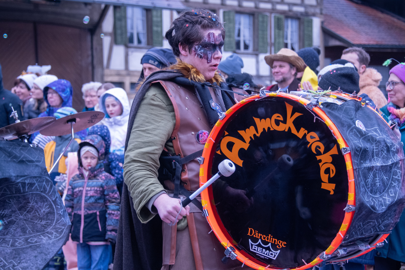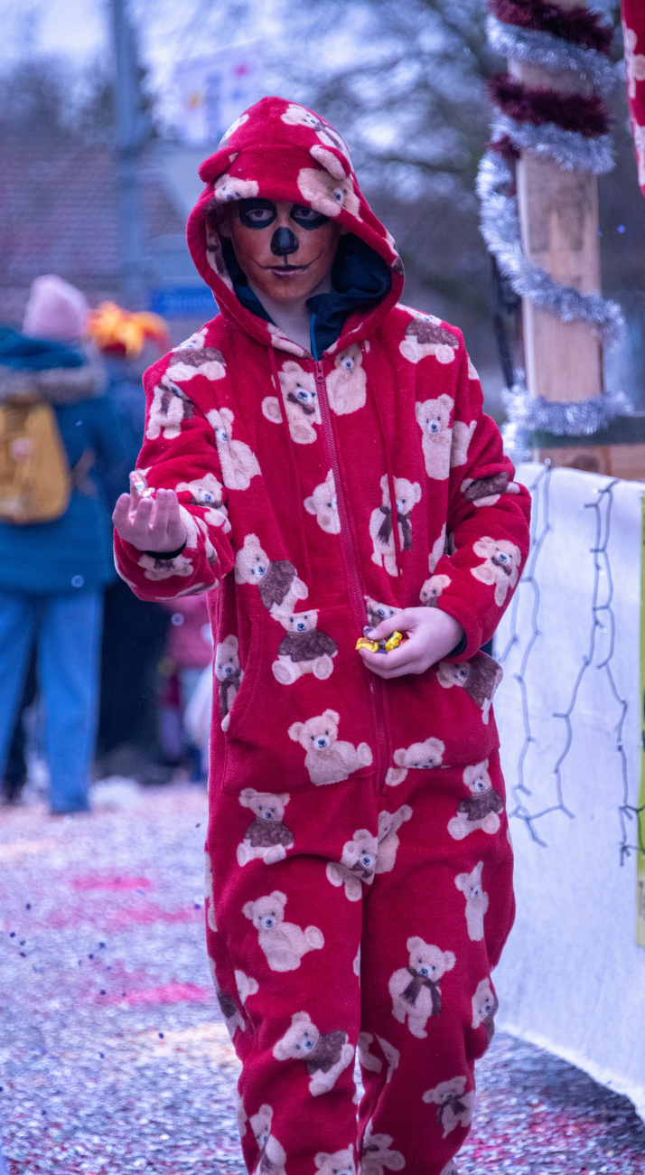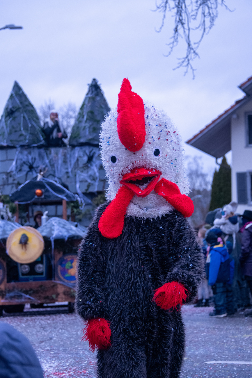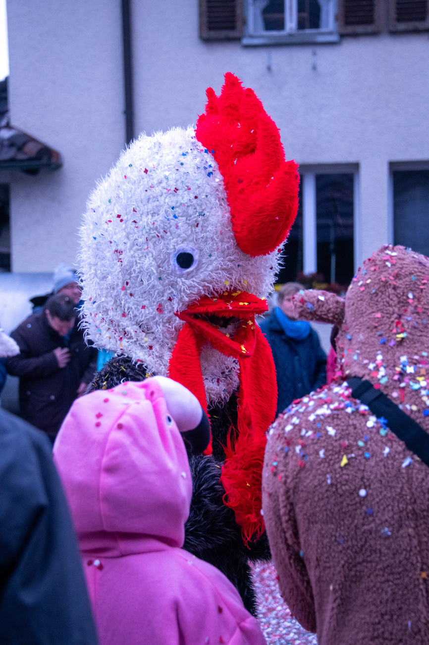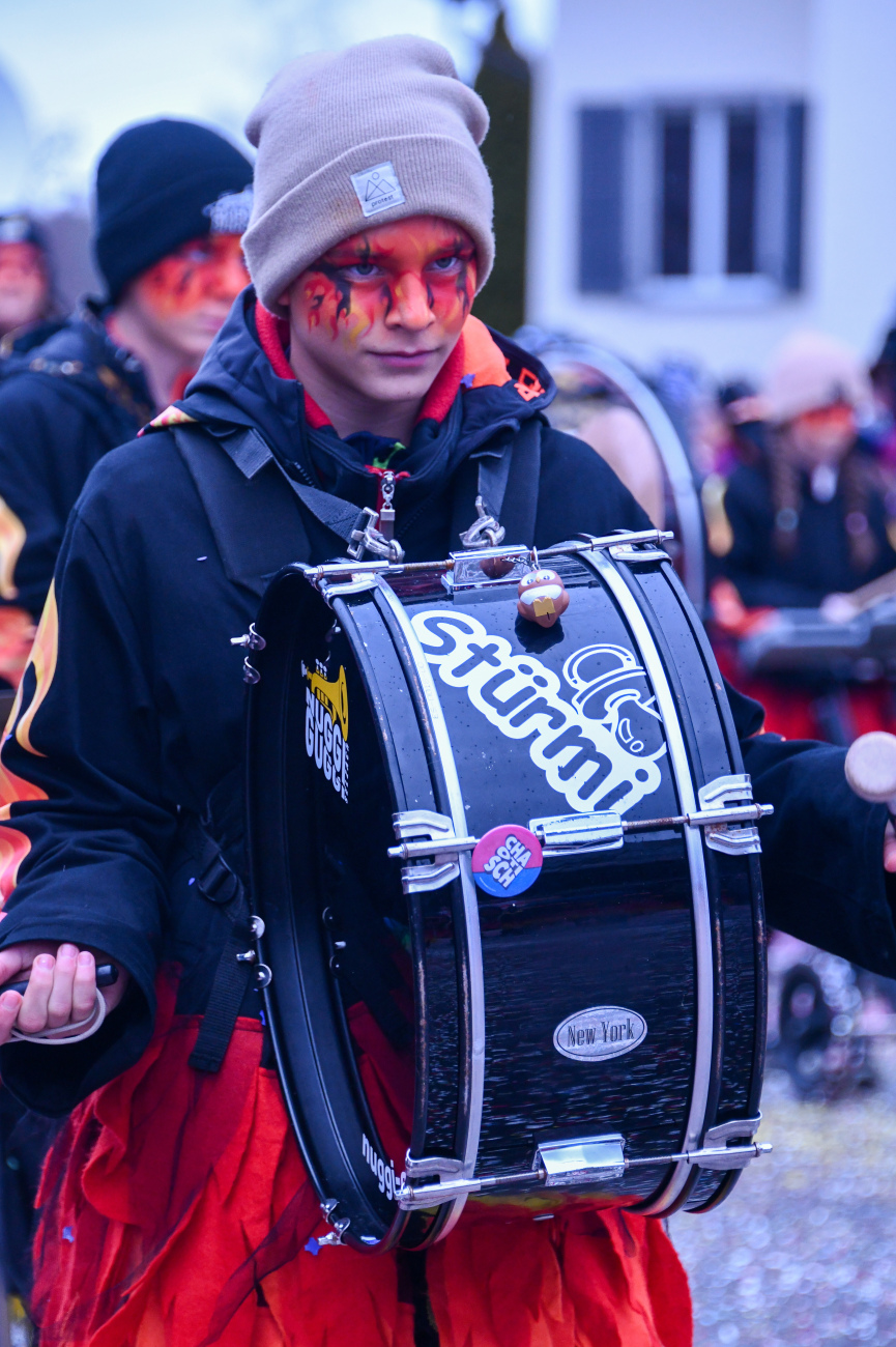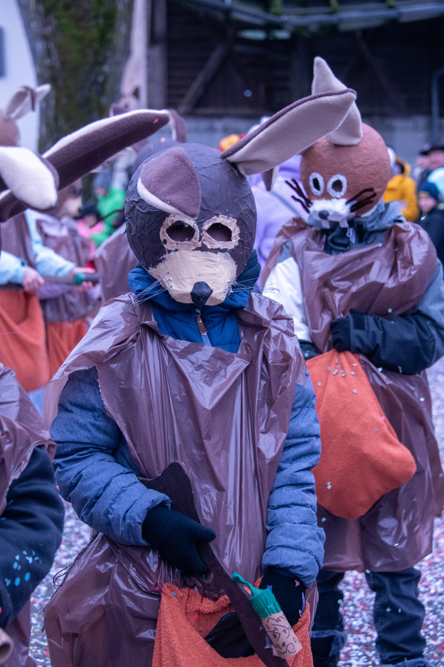 Pünktlich um 14.05 Uhr am Samstag, 21. Februar 2026, ertönte dann der legendäre Knall, der den Fasnachtsumzug in Gang setzte. Genau zum Start des Umzugs hörte der Regen auf, als hätte er dem närrischen Treiben bewusst Platz gemacht. Angeführt von der ortsansässigen Guggenmusik «Fädereböck» zogen kreative Wagen und witzig verkleidete Gestalten durch das Dorf. Einige Gruppen präsentierten ihre Sujets mit originellen Ideen, die für laute Lacher sorgten. Fast die gesamte Dorfbevölkerung säumte die Strassenränder, wetterbedingt warm eingepackt und gut gelaunt. Neben Sugus und anderen Süssigkeiten wurden sogar frisch gegrillte Würste in die Menge gereicht – eine willkommene Überraschung an einem eher kühlen Tag. Konfetti in allen erdenklichen Farben wirbelten durch die Luft und Partymusik sorgte für ausgelassene Stimmung – getreu dem Song der «GrossstadtEngel»: «Wir haben oben gute Laune und unten gute Laune, vorne gute Laune und hinten gute Laune!»