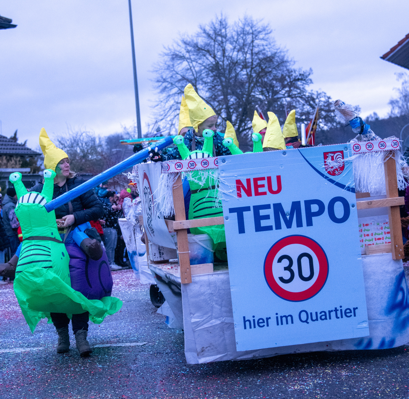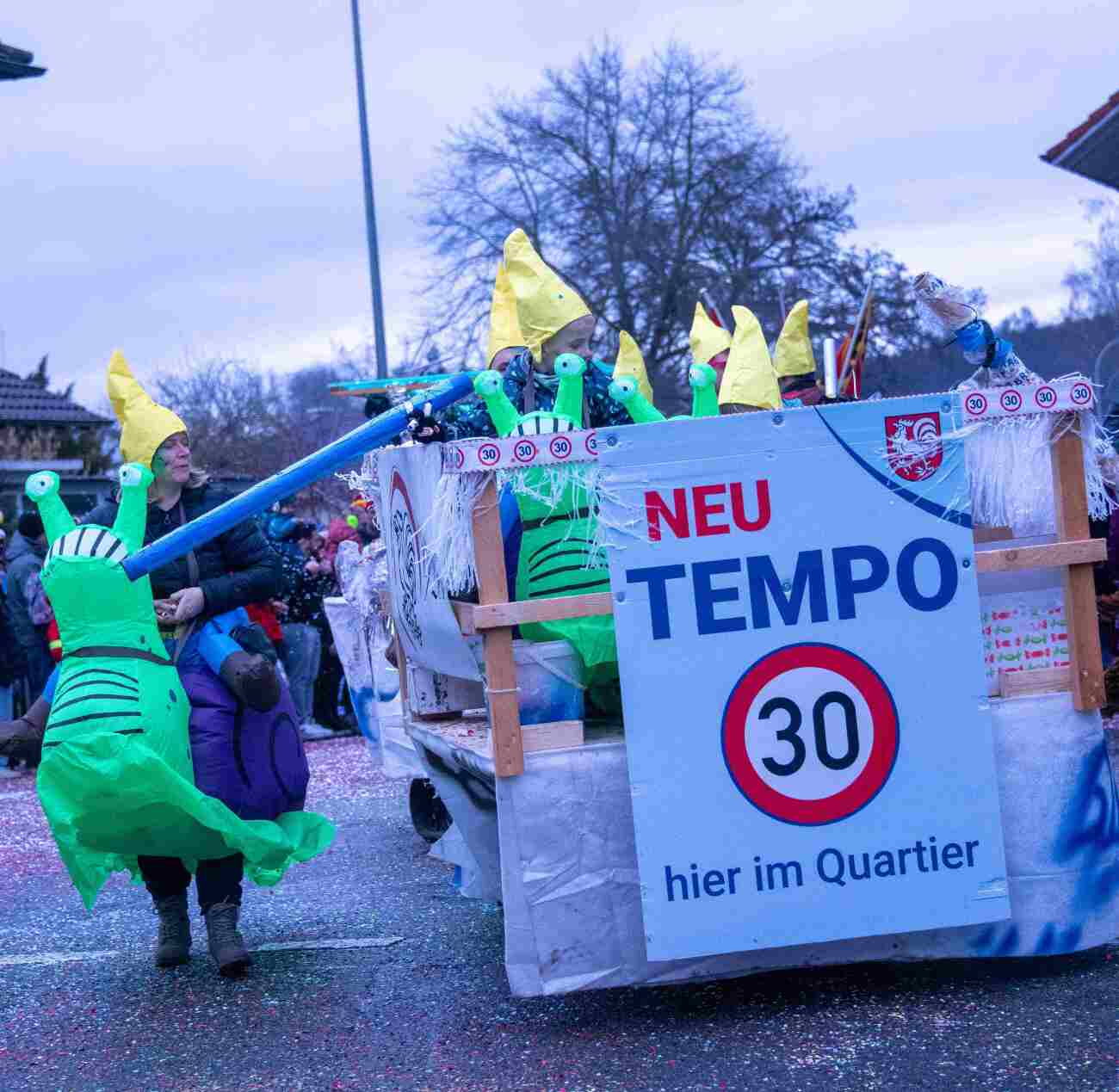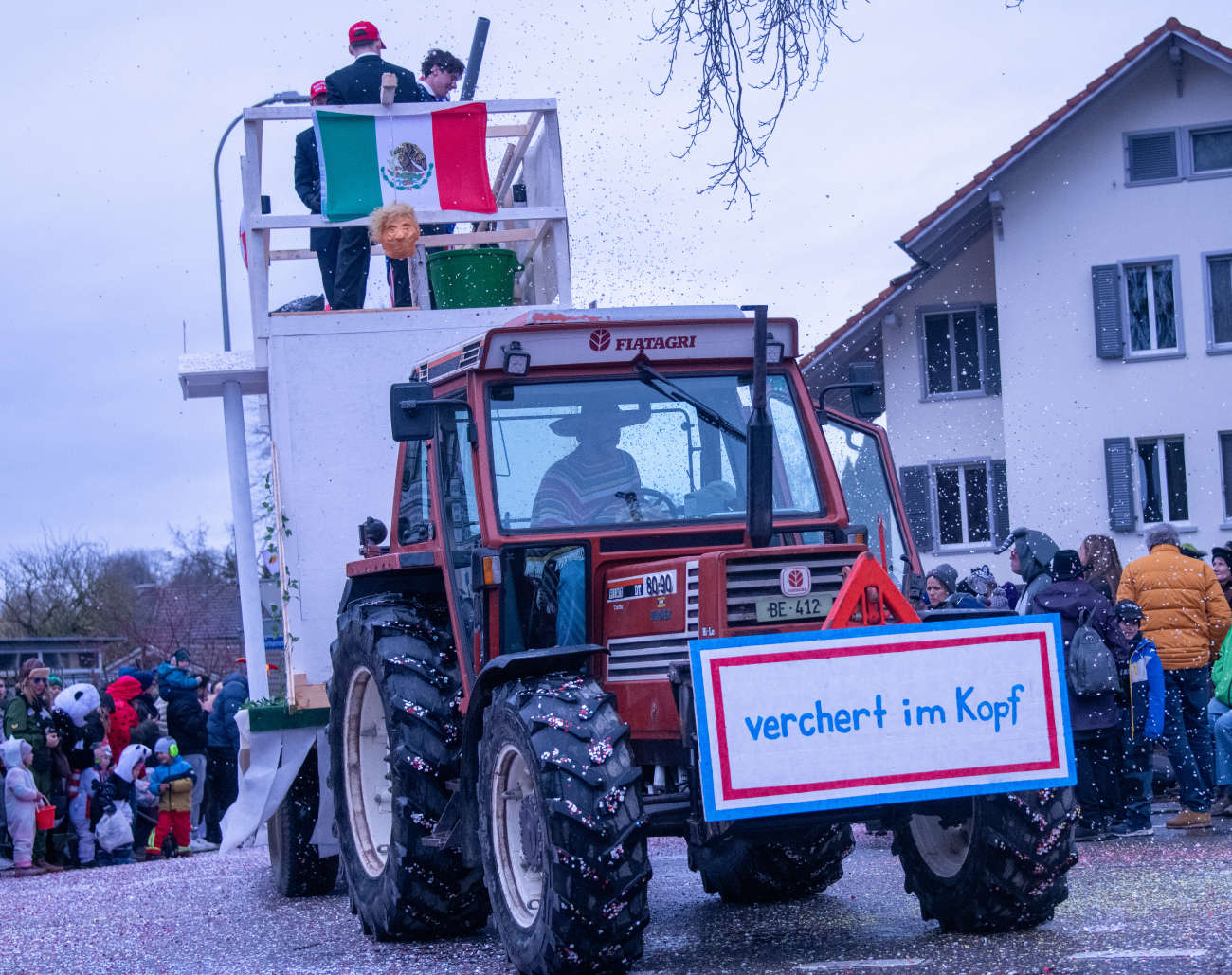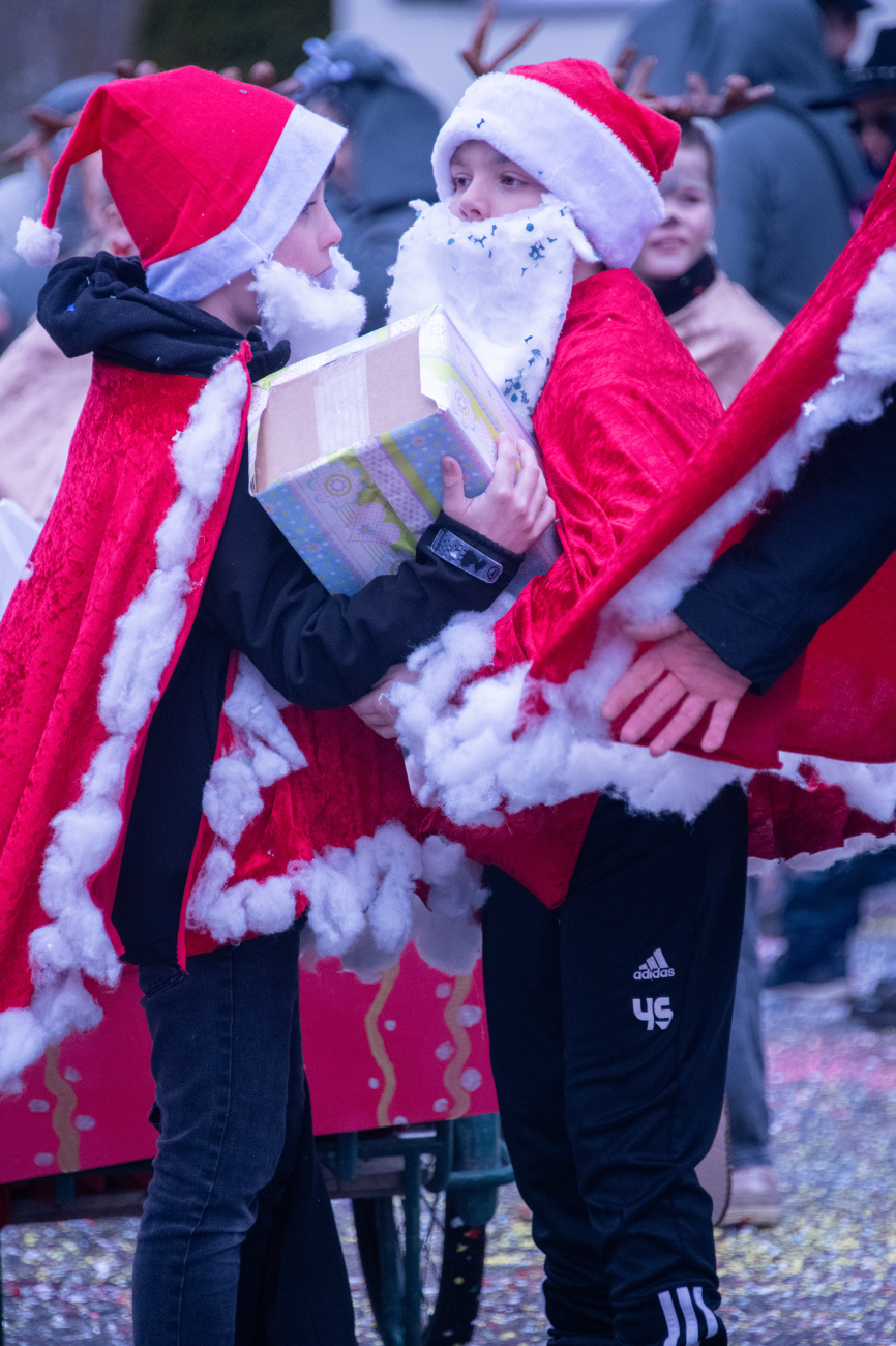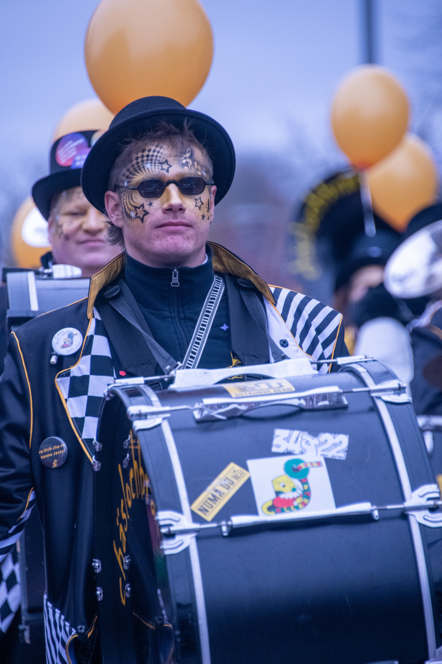 Pünktlich um 14.05 Uhr am Samstag, 21. Februar 2026, ertönte dann der legendäre Knall, der den Fasnachtsumzug in Gang setzte. Genau zum Start des Umzugs hörte der Regen auf, als hätte er dem närrischen Treiben bewusst Platz gemacht. Angeführt von der ortsansässigen Guggenmusik «Fädereböck» zogen kreative Wagen und witzig verkleidete Gestalten durch das Dorf. Einige Gruppen präsentierten ihre Sujets mit originellen Ideen, die für laute Lacher sorgten. Fast die gesamte Dorfbevölkerung säumte die Strassenränder, wetterbedingt warm eingepackt und gut gelaunt. Neben Sugus und anderen Süssigkeiten wurden sogar frisch gegrillte Würste in die Menge gereicht – eine willkommene Überraschung an einem eher kühlen Tag. Konfetti in allen erdenklichen Farben wirbelten durch die Luft und Partymusik sorgte für ausgelassene Stimmung – getreu dem Song der «GrossstadtEngel»: «Wir haben oben gute Laune und unten gute Laune, vorne gute Laune und hinten gute Laune!»