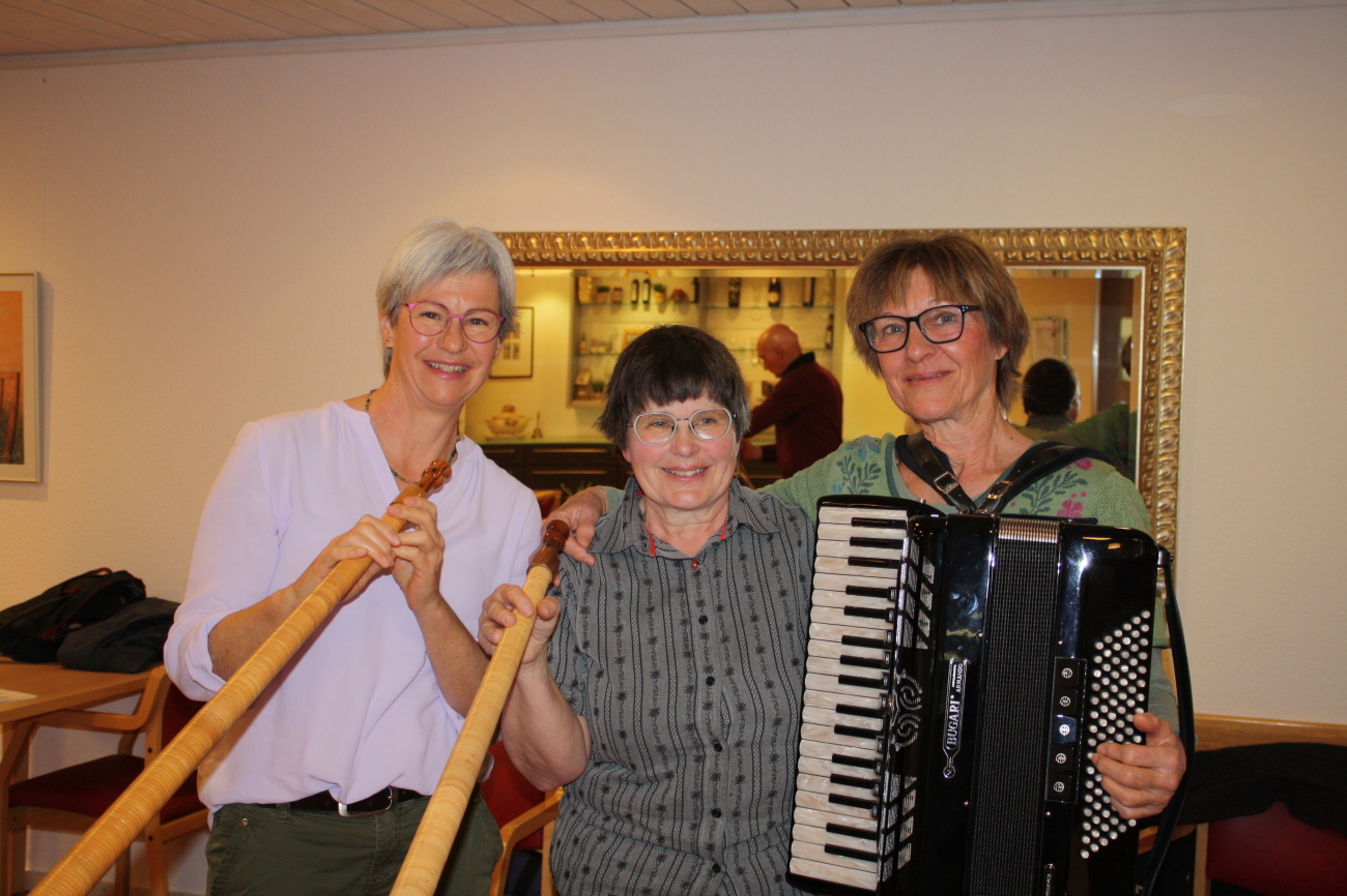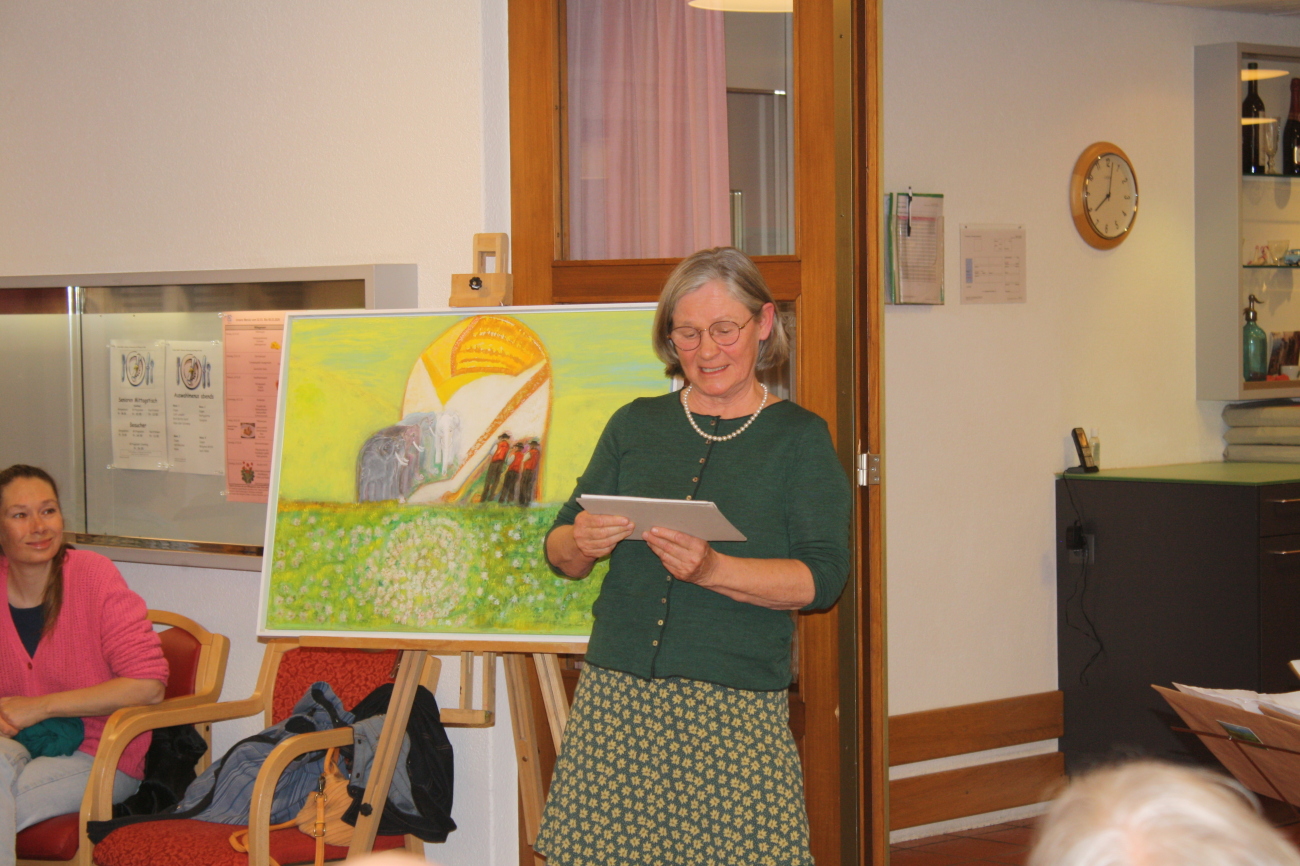 Die Magie des Ortes, die Kraft der Vision und das Durchscheinen des Transzendenten wirkten auch beim Betrachten dieses Werks und der Beschreibung, die Elsa Kunz aus den «Orangen Träumen» von Margrit Kiener vorlas, nach. Dass sich die Künstlerin für die musikalische Umrahmung der Vernissage zwei Alphörner und ein Akkordeon (Magdalena Wenger, Ruth Bangerter und Ruth Burkhard) ausgesucht hatte, war das Tüpfchen auf